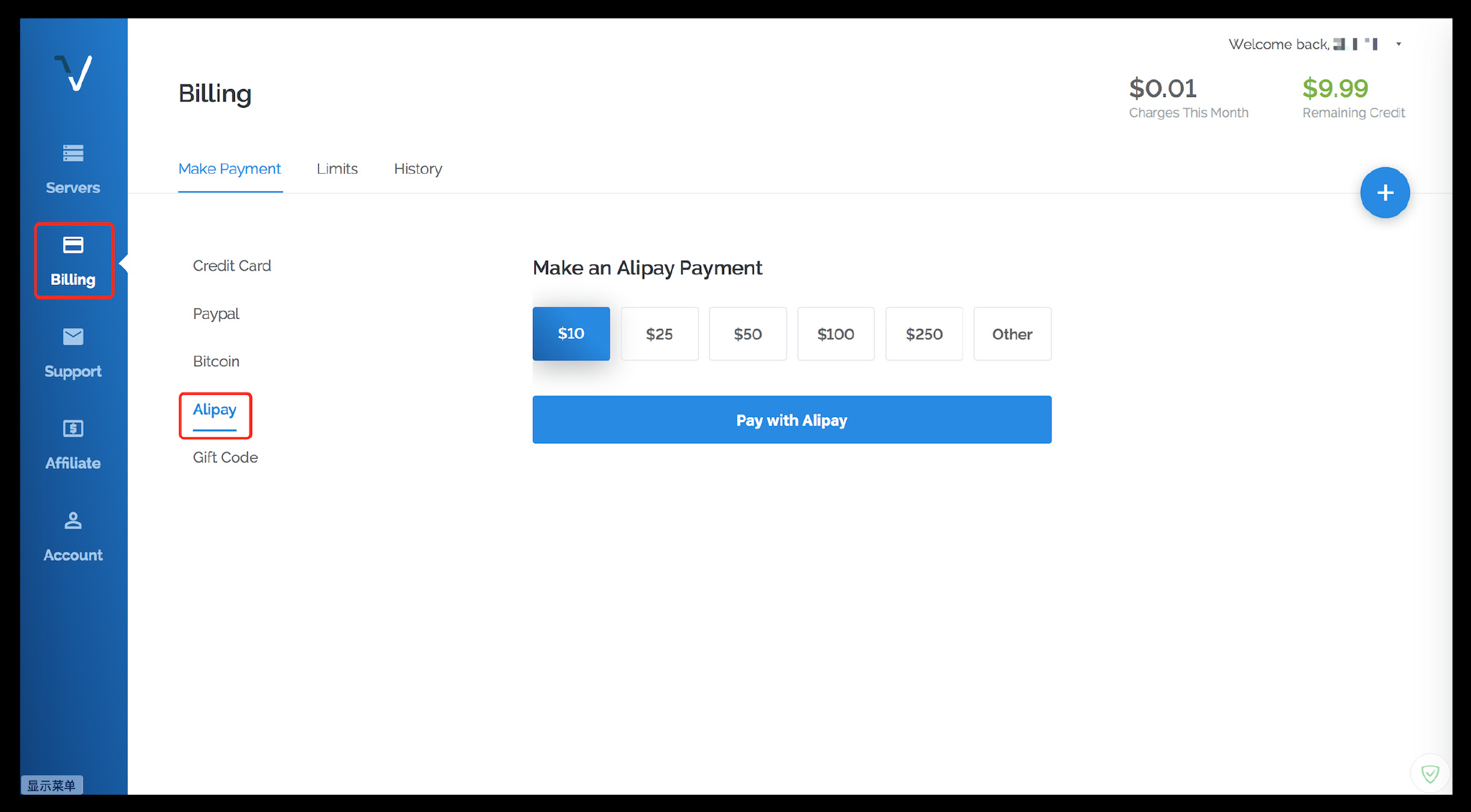 - 部署服务器之前,需要先充钱到账户里,选择左侧菜单中的 - Billing,- Vultr已经支持支付宝支付了,选择- Alipay然后充值最低金额- $10就行了,折合- RMB大概- 65块左右。