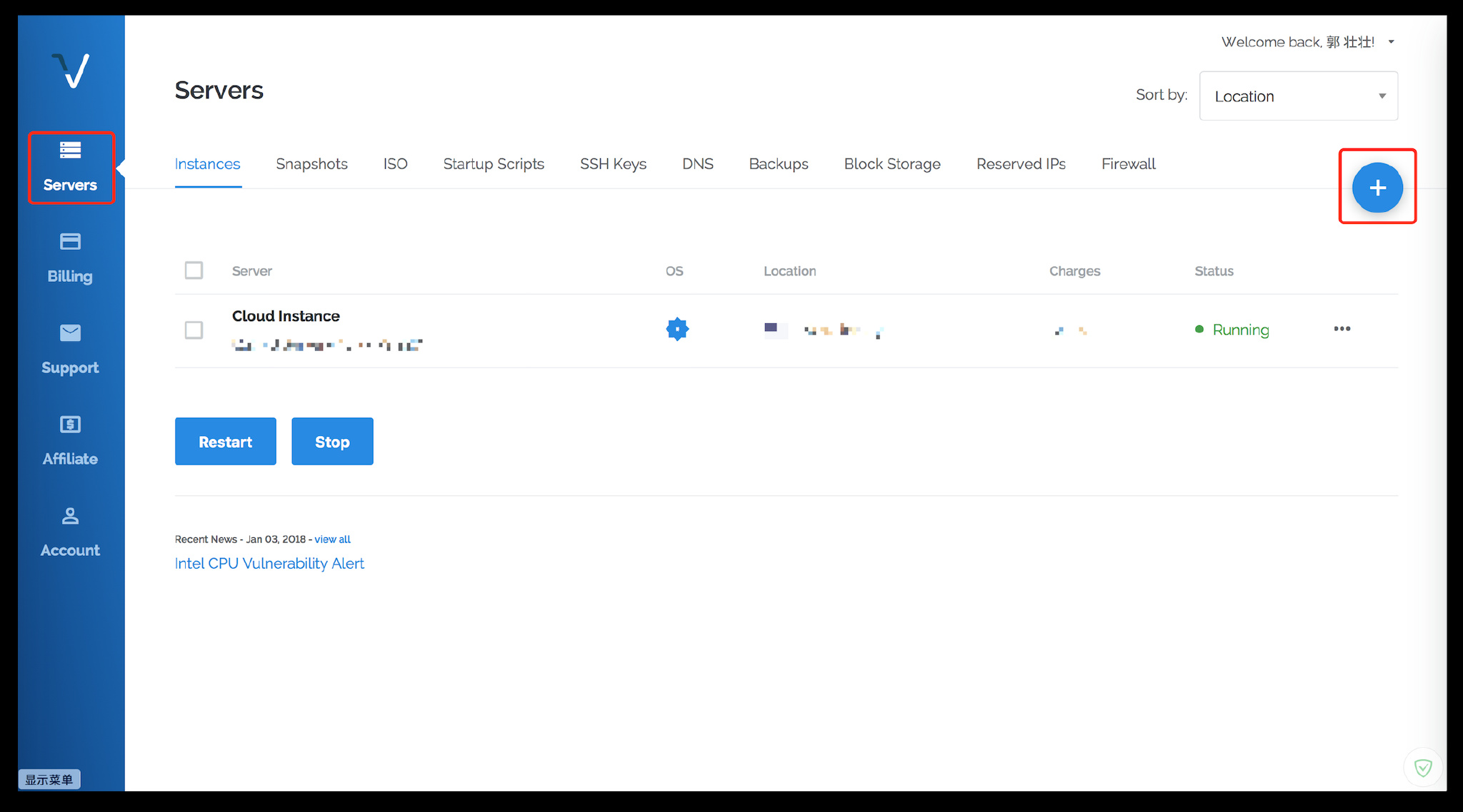 - 充值完以后,就可以开始购买 VPS服务器了,选择左侧菜单中的Servers,选择右上角的+前往服务器选择页面。