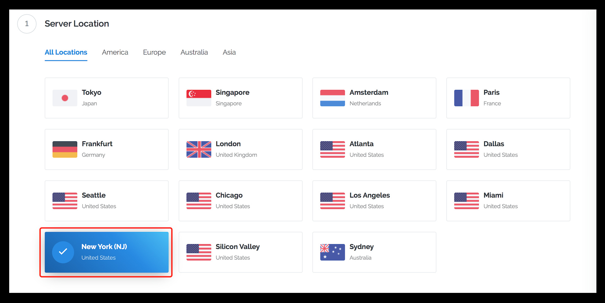 - 选择一个服务器的地区,这里可以根据自己的需求选择,建议选择 日本(Tokyo)或新加坡(Singapore),因为离我们比较近可能速度会快一点,我这里选择的是New York (NJ)。