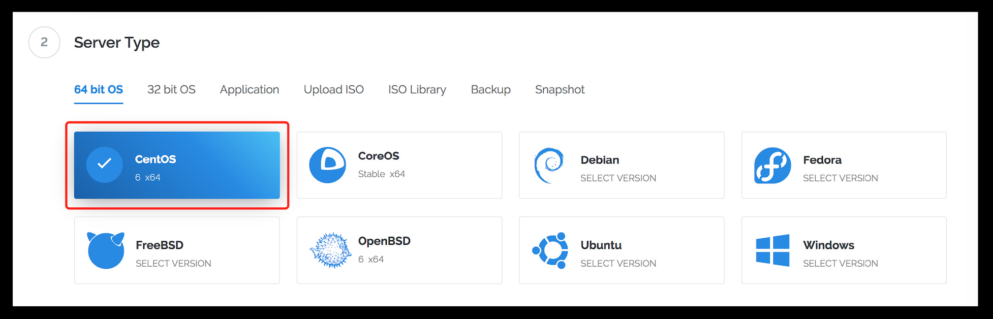 - 然后选择 CentOS 6 x64系统,这里要注意是6 x64,不要选择7 x64,CentOS 7默认的防火墙可能会干扰SSR的正常连接!(点击7 x64的文字就可以切换成6 x64)