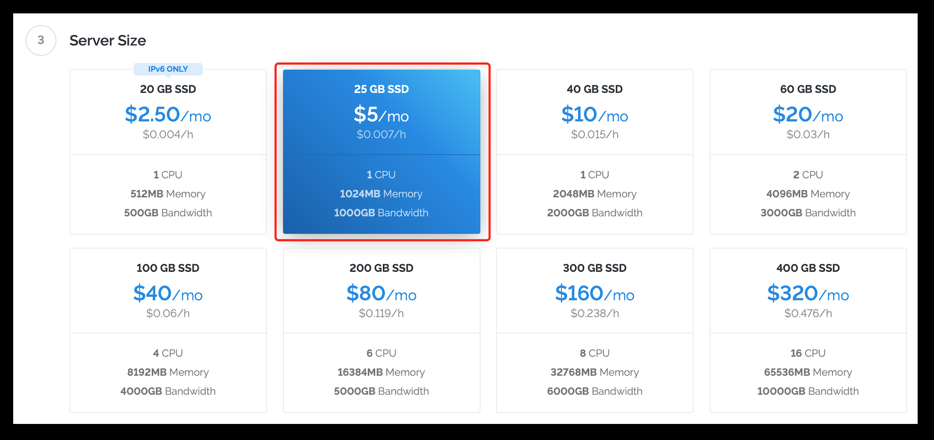- 然后选择系统配置,这里要选择 $5.0一个月的配置,$2.5一个月的配置已经不支持IPV4了,所以用不了。