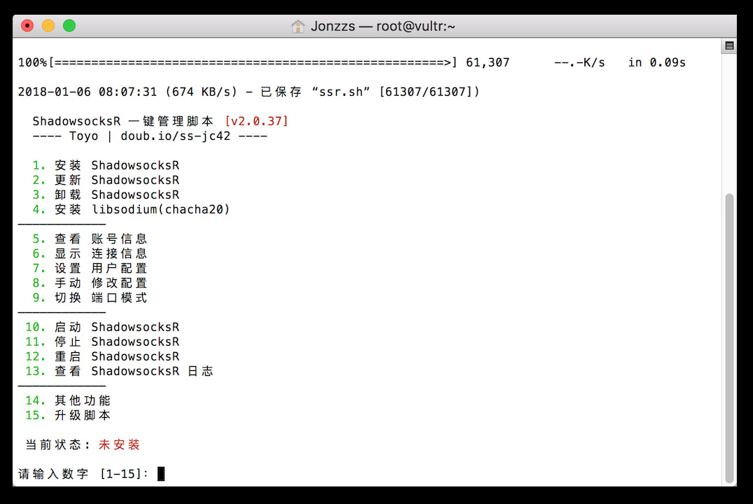 - 出现以下界面后,输入 1然后回车开始安装ShadowsocksR(如果没有出现以下界面,说明上面地址失效了,网上重新找一个SSR安装脚本地址即可)。