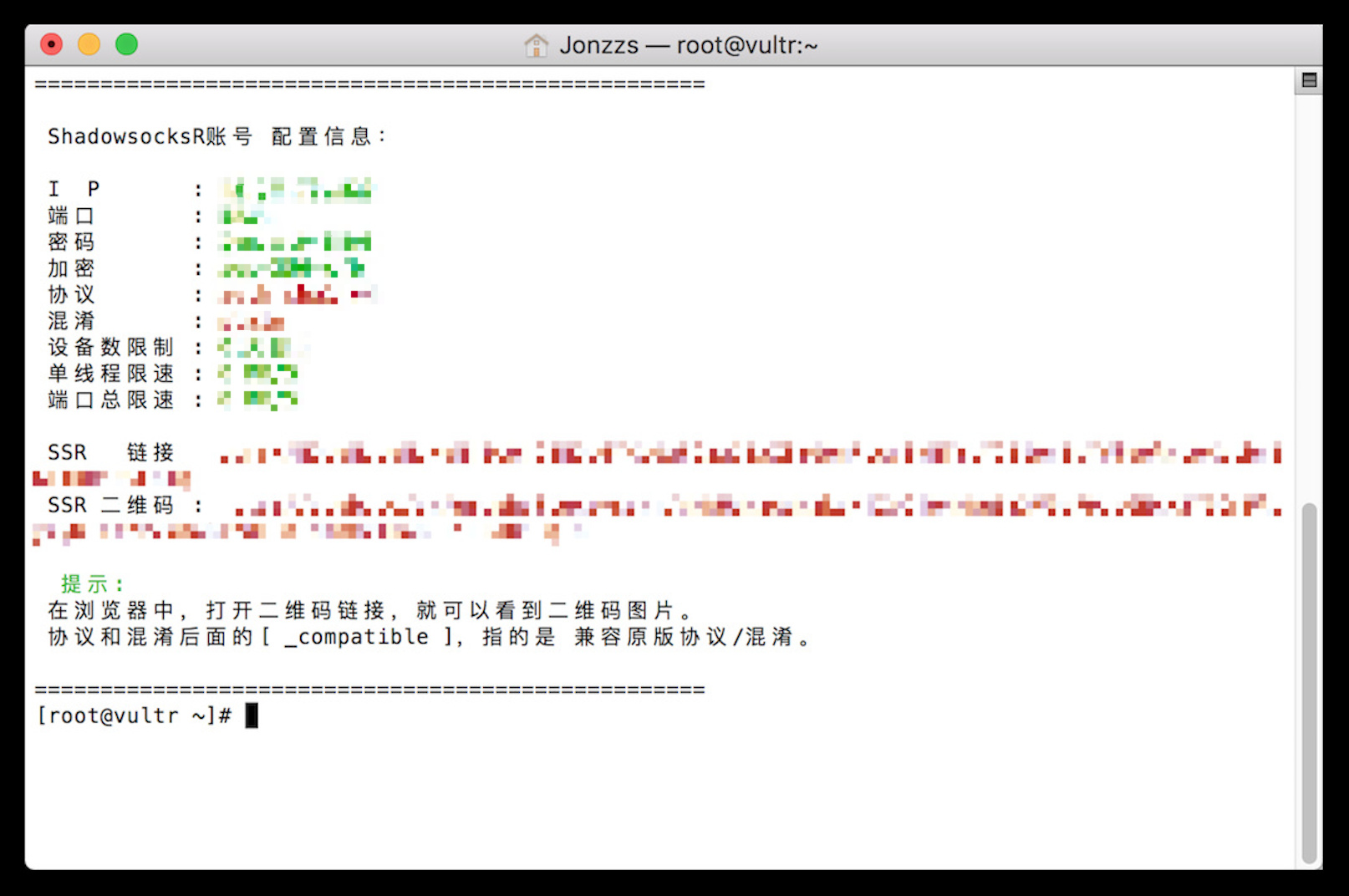 - 最后出现如下界面表示部署成功,界面中会显示你的 - SSR账号信息。