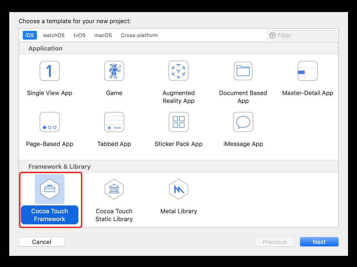 - 新建一个工程或者在现有工程下创建一个新的 - target,类型需要选择- Coaoa Touch Framework,这里说一下我的- Xcode版本是- 10.0.0。![]()