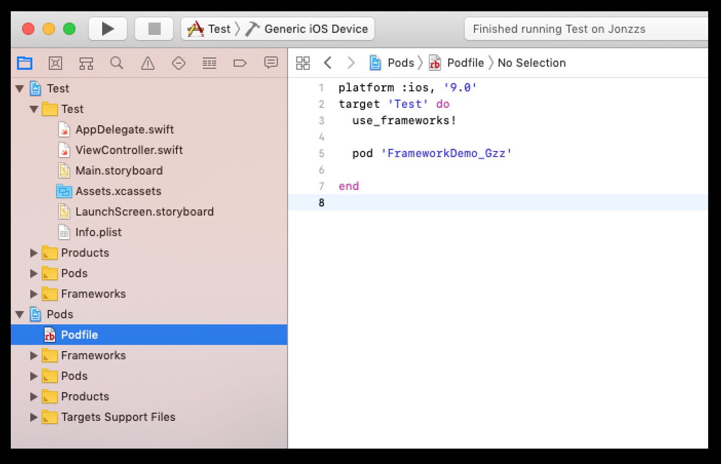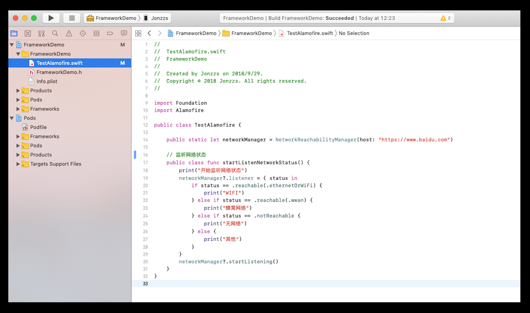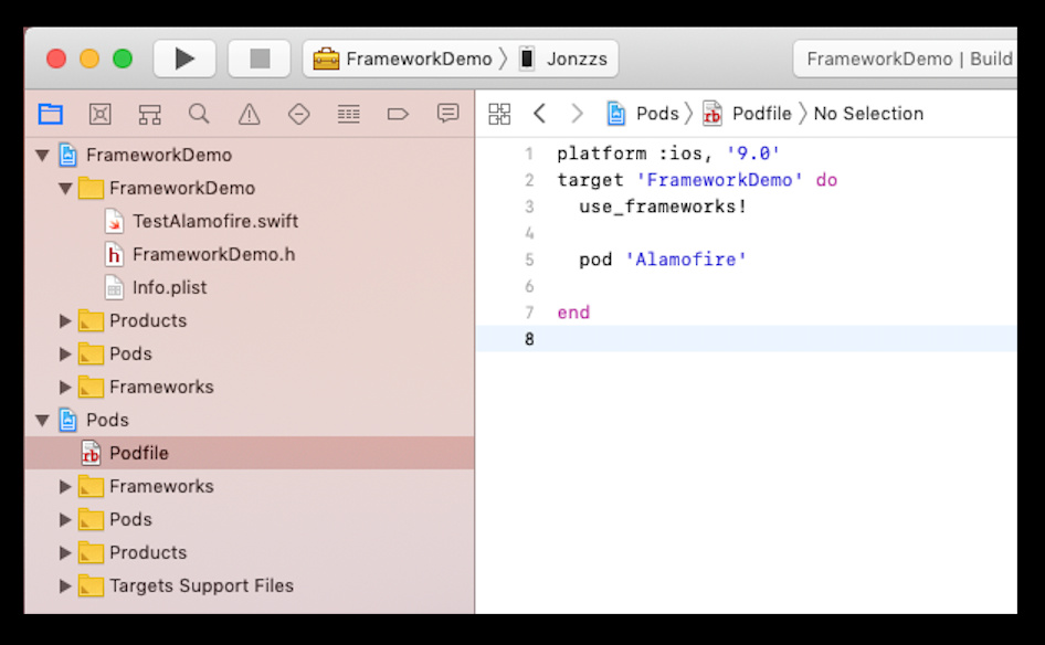- 创建 - podfile并加入- pod 'Alamofire',然后执行- pod install,然后选择工程下的- FrameworkDemo.xcworkspace重新打开工程。![]()