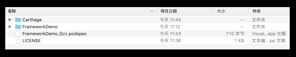 - 在仓库目录下新建一个 - podspec文件,文件名就是- pod库的名称,我这边叫- FrameworkDemo_Gzz.podspec,或者使用以下命令创建。- pod spec create FrameworkDemo_Gzz ![]()