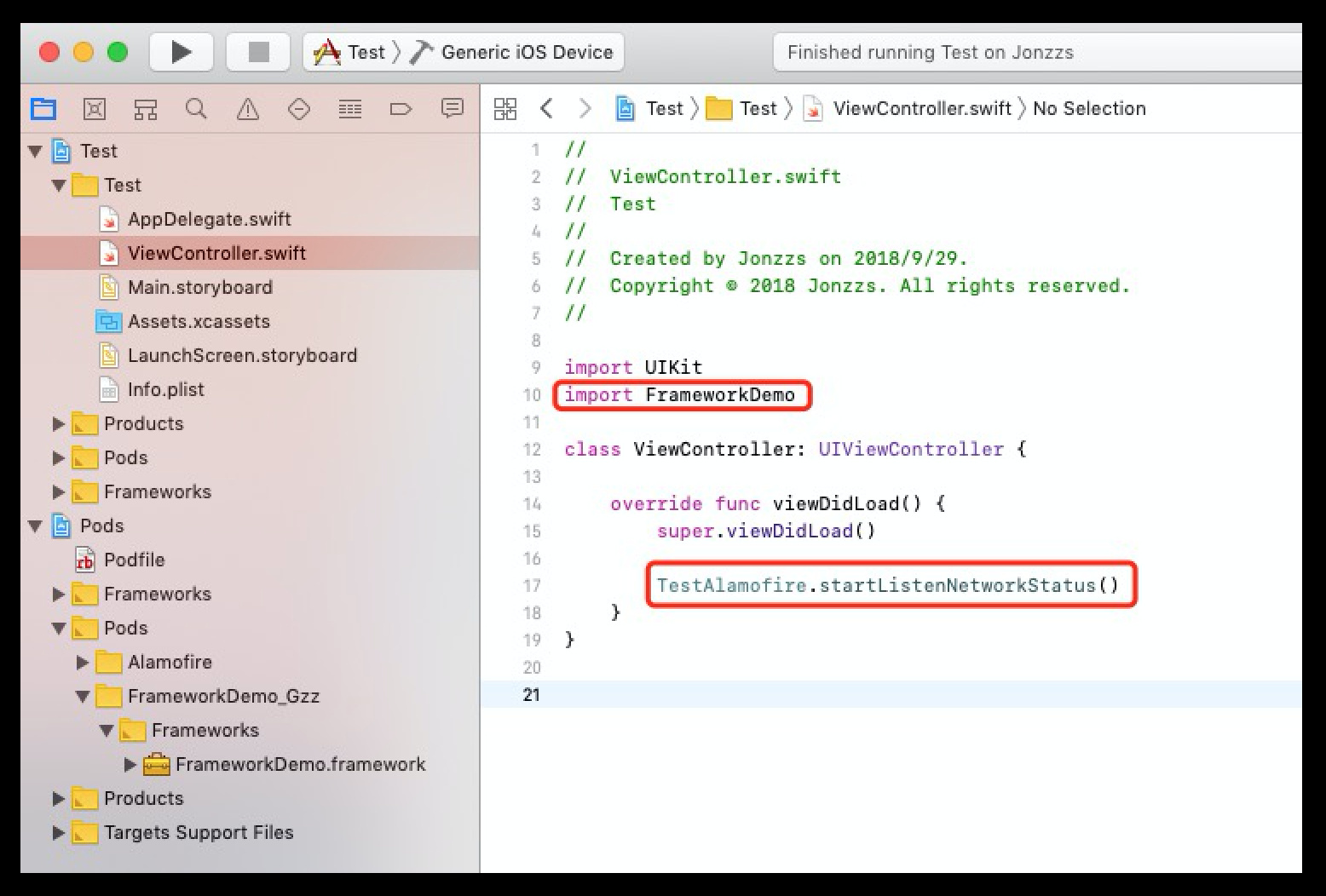 - 然后在控制器中 - import FrameworkDemo引入我们的库,执行库中用到- Alamofire的一个方法。![]()