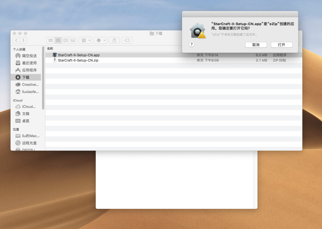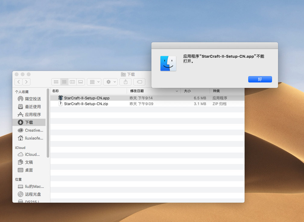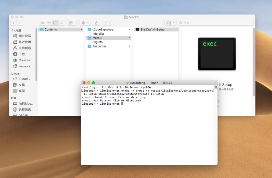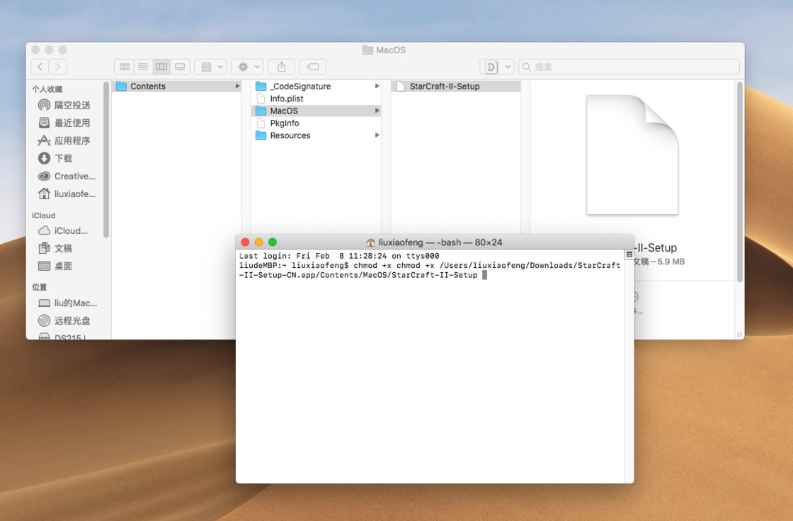 - 之后再将文件 - StarCraft-II-Setup拖入终端(为了输入完整的执行路径),完整的命令如下:- chmod +x /Users/liuxiaofeng/Downloads/StarCraft-II-Setup-CN.app/Contents/MacOS/StarCraft-II-Setup ![]()