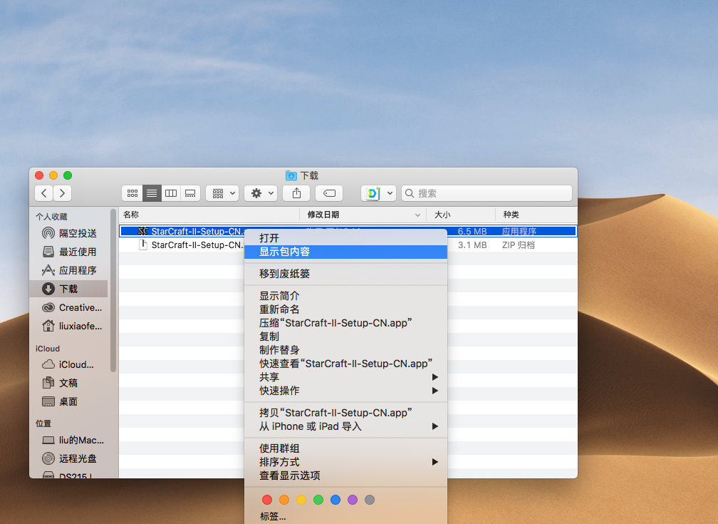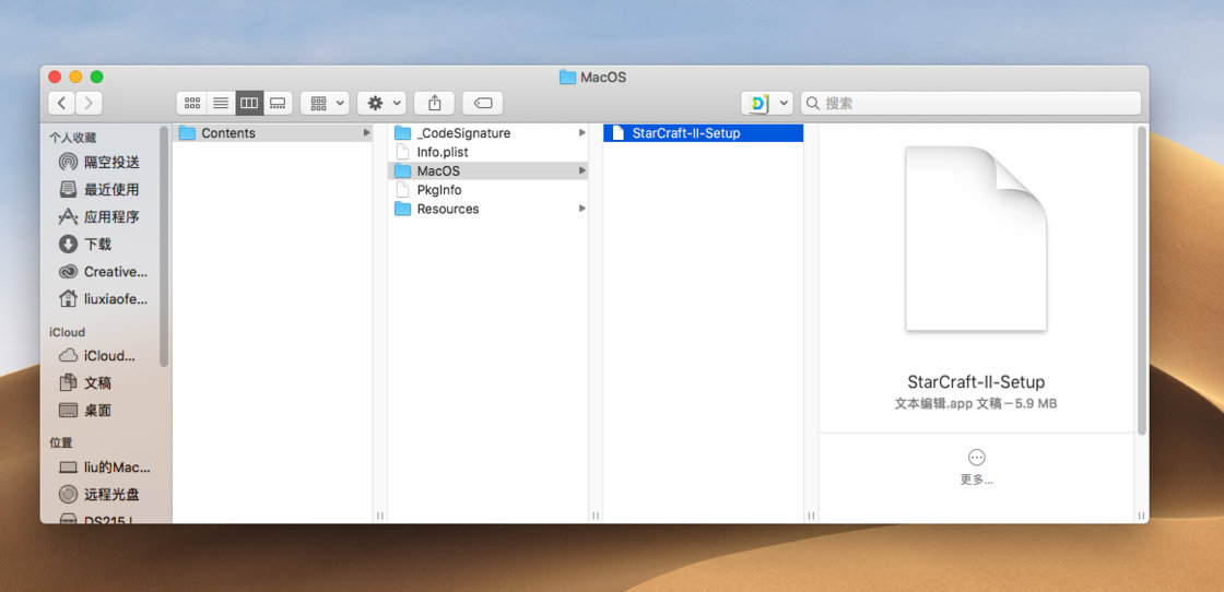 - 之后依次展开 - Contents-- MacOS,找到对应文件夹下的文件,比如说截图中显示的- StarCraft-II-Setup。如果权限正确的话,该文件应该是一个- Unix可执行的文件,而不是现在这种类型不明的文件。![]()